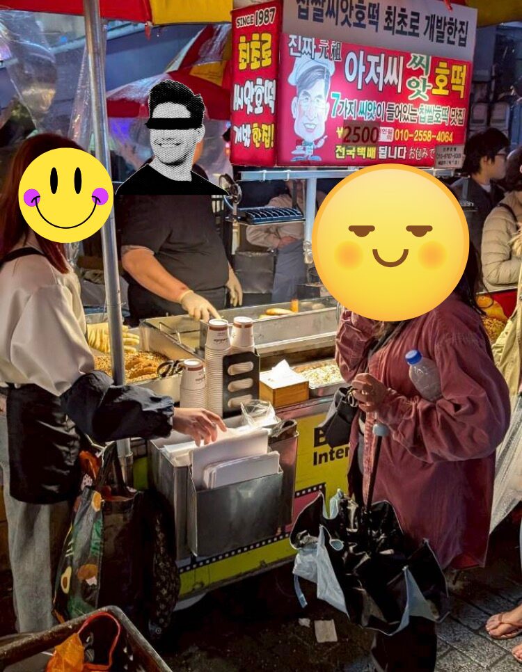 前回大ハマリして、2回食べた大好きなホットクをパクり。看板のアジョシ(おじさん)マークのお店が有名だそうで、雨の中行列でしたが、回転早く待ち時間5分ちょっと。
